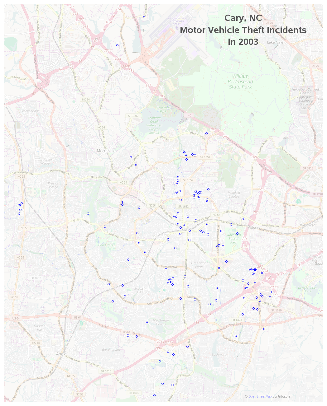 | 18 | MV THEFT - AUTO | 2017-05-31 | 117 | NC 55 HWY | 35.785 | -78.873 | 17004643 | HIGH HOUSE CROSSING SHOP CENTE | |