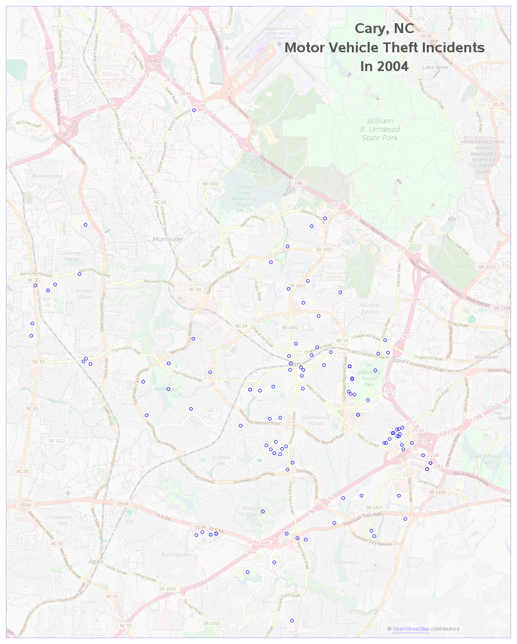 | 20 | MV THEFT - ALL OTHER VEHICLES | 2016-04-19 | 111 | GRANDE VALLEY CIR | 35.804 | -78.787 | 16003114 | HARRISON GRANDE AT CARY APTS | HARRISON GRANDE AT CARY APTS. |