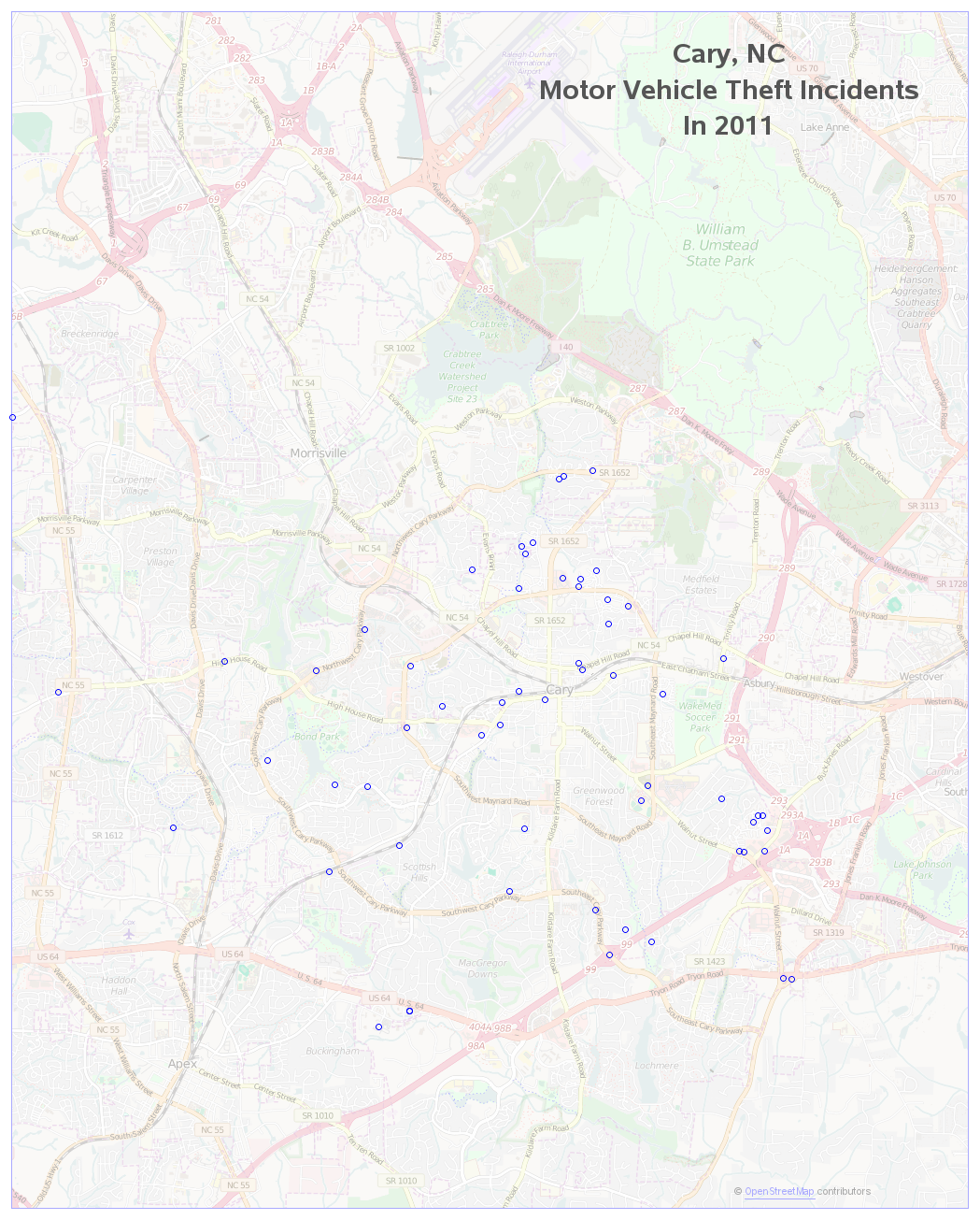 | 59 | MV THEFT - AUTO | 2016-10-29 | 116 | AUTO MALL DR | 35.740 | -78.809 | 16010046 | CARY AUTO PARK | |