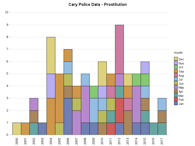 | 5 | PROSTITUTION | 2012-05-15 | 115 | SW MAYNARD RD | 35.774 | -78.800 | 12004487 | SAVON HEIGHTS | |
