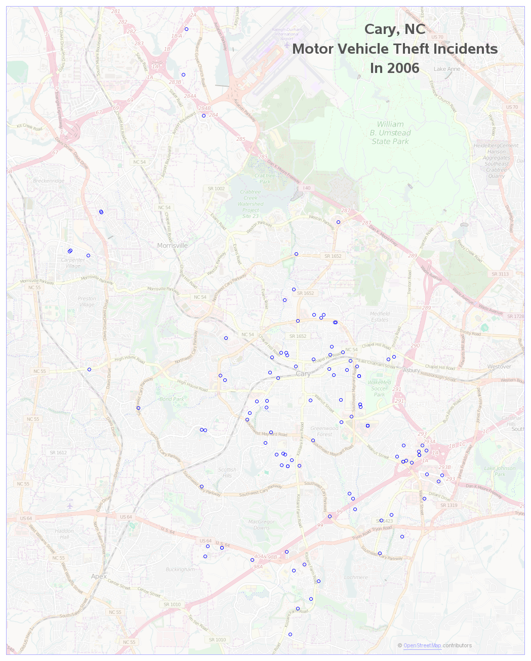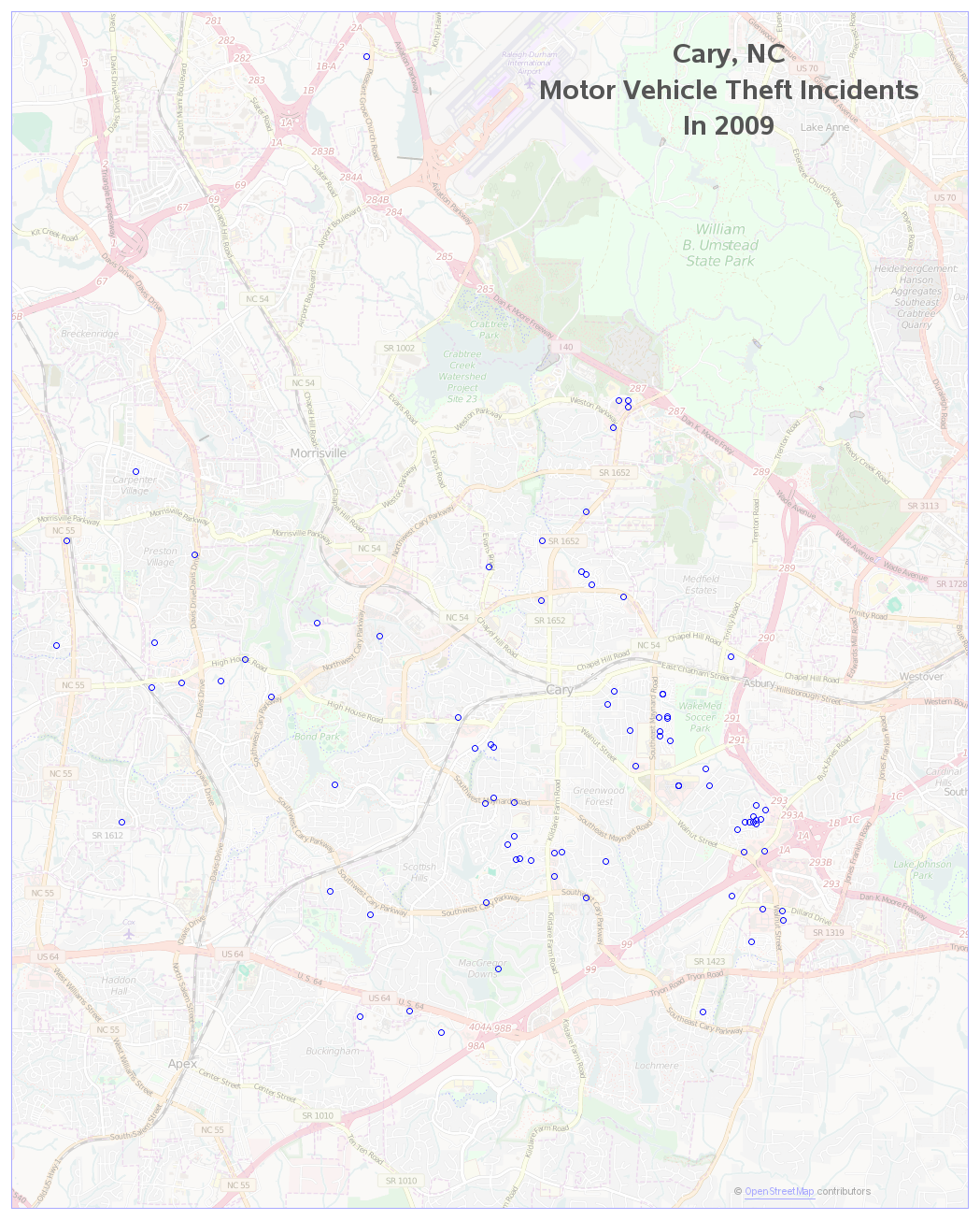 | 59 | MV THEFT - AUTO | 2016-10-29 | 116 | AUTO MALL DR | 35.740 | -78.809 | 16010046 | CARY AUTO PARK | |