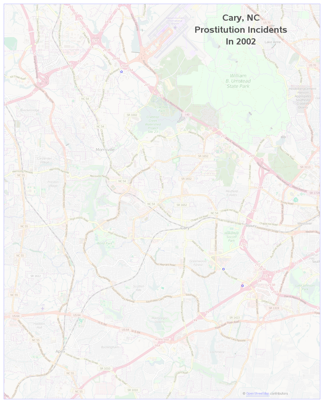 | 2 | SEX OFF - PROSTITUTION | 2002-04-18 | 111 | AERIAL CENTER PKWY | 35.858 | -78.816 | 02001645 | AERIAL CENTER EXECUTIVE PARK | |